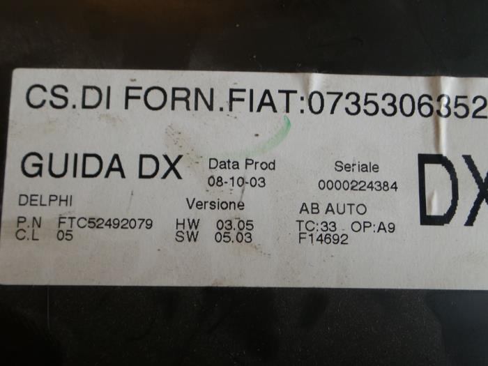 | Wagennummer | V278 | Bouwjaar | 2004 | Motortype | Benzine | Cilinderinhoud | 2000 | Tellerstand | 80994 | Motorcode | 32310 | Kleppen | 16 | Vermogen | 110 | Versnellingsbak | 5 Bak | Aandrijving | Voorwiel | Airco | Ja(leeg) | Deuren | 4Dr | Uitvoering | Hatchback | Kleur voertuig | Zwart | Laknummer voertuig | 601 | Centrale deurvergrendeling | Ja | ABS | Ja | Wielbouten | 5 | Chassisnummer | ZAR937000******** |